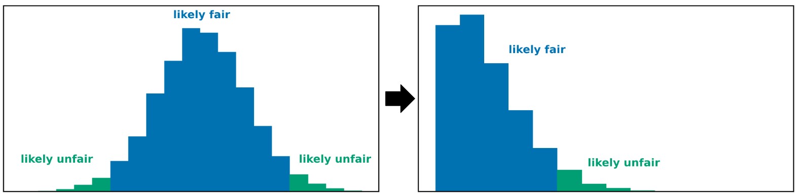 This means that the histogram above is divided into three regions, where two of them mean the same thing (we think our coin is unfair).